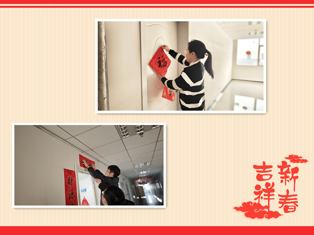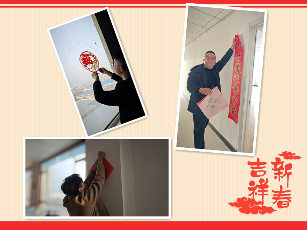 贴窗花活动也在火热进行中。五颜六色的窗花堆放在桌上,精美的图案让人目不暇接,有寓意吉祥如意的牡丹、象征年年有余的金鱼,还有充满童趣的生肖兔。员工们拿着剪刀和胶水,认真地裁剪、粘贴,不一会儿,办公室的窗户便焕然一新,变得格外喜庆。透过这些窗花,阳光洒在办公桌上,仿佛为整个办公区域披上了一层绚丽的节日盛装。看着自己亲手装点的窗户,大家都感到无比满足,仿佛提前感受到了新年的热闹与温馨。