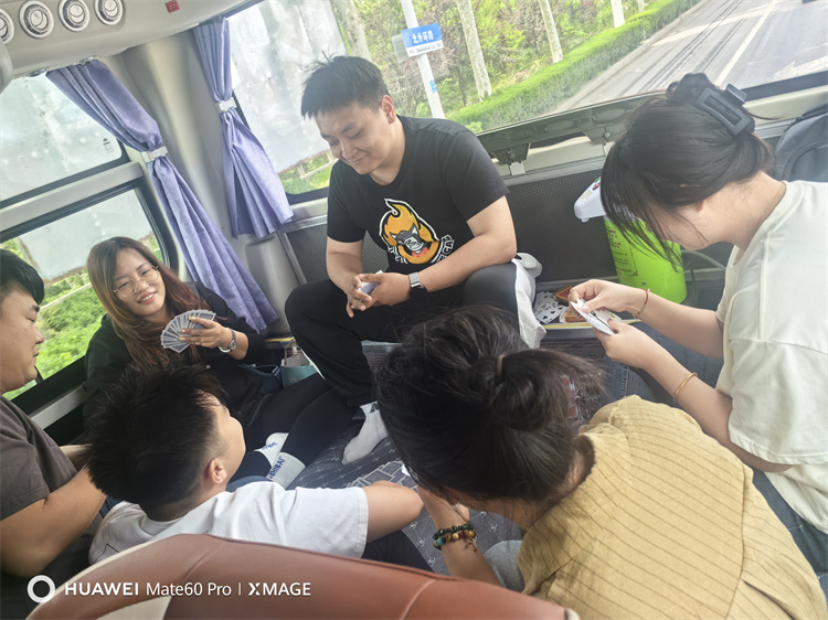上午十点,大巴准时出发。车厢内欢声笑语不断,一群男同事围坐在一起打扑克,牌桌上你来我往,气氛热烈。女同事们则围在另一边,聊起了家长里短,分享着生活趣事。有趣的是,话题不知不觉就转到了客户身上,大家你一言我一语,交流着最近的客户情况和沟通心得,欢笑声中也不乏对工作的思考。