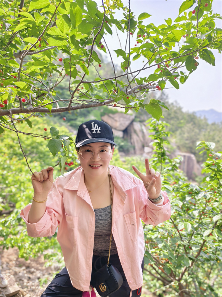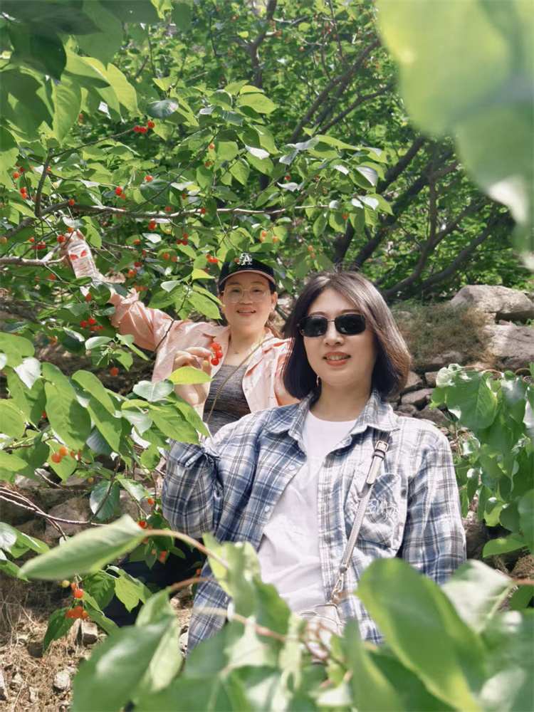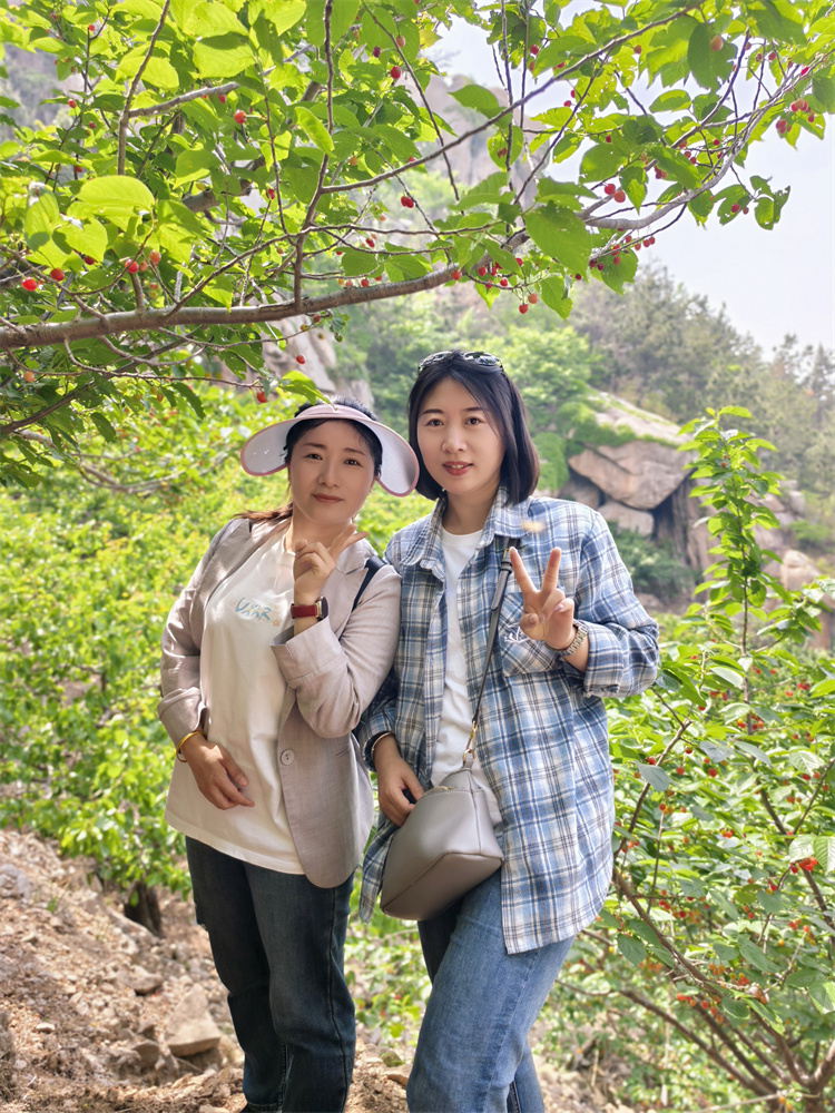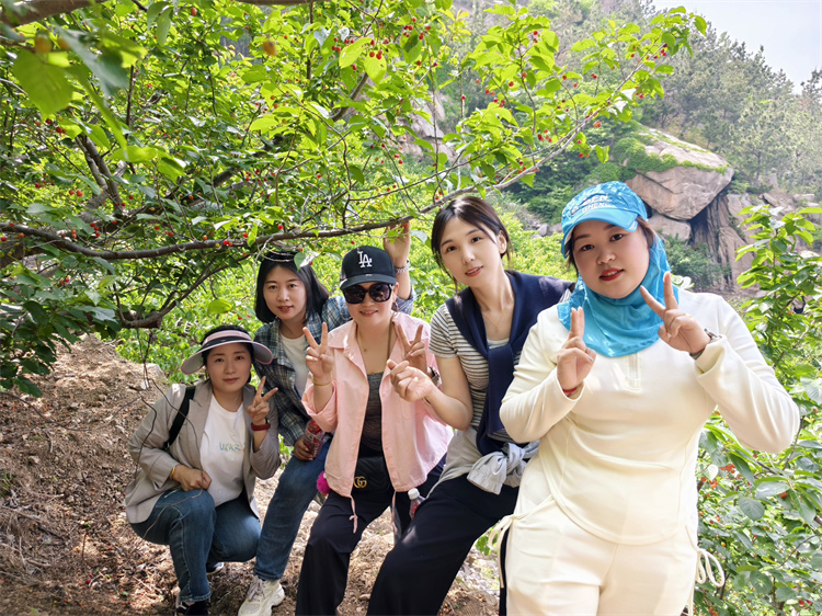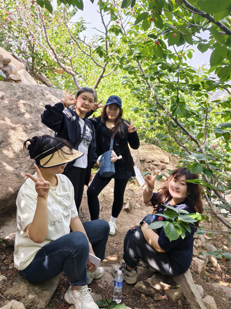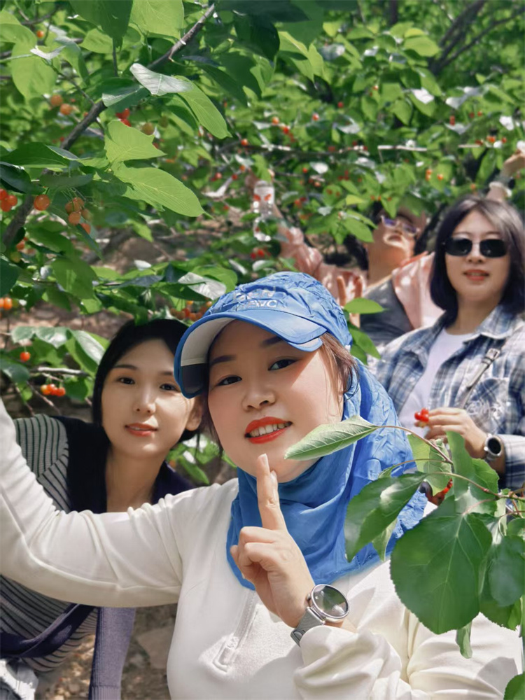 饭后,大家迫不及待地奔向樱桃园。崂山的樱桃树漫山遍野,红彤彤的樱桃挂满枝头,仿佛在向大家招手。我们分成几个小组,穿梭在樱桃林中。大家一边采摘樱桃,一边交流着工作。有人发现不同位置的樱桃成熟度不同,这让大家联想到在客户开发中也要精准定位;有人分享摘樱桃的技巧,这又让负责销售技巧培训的同事有了新的思路。欢声笑语中,大家不仅收获了美味的樱桃,更碰撞出了工作的火花。