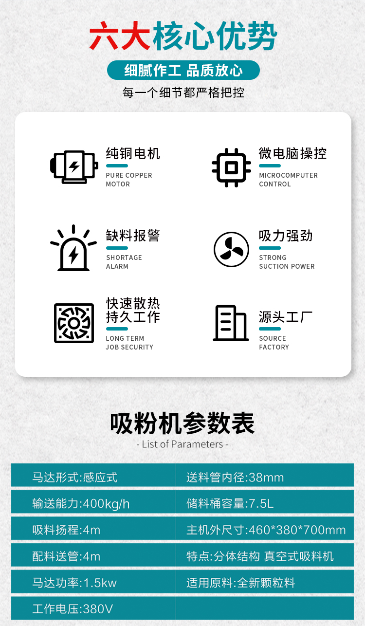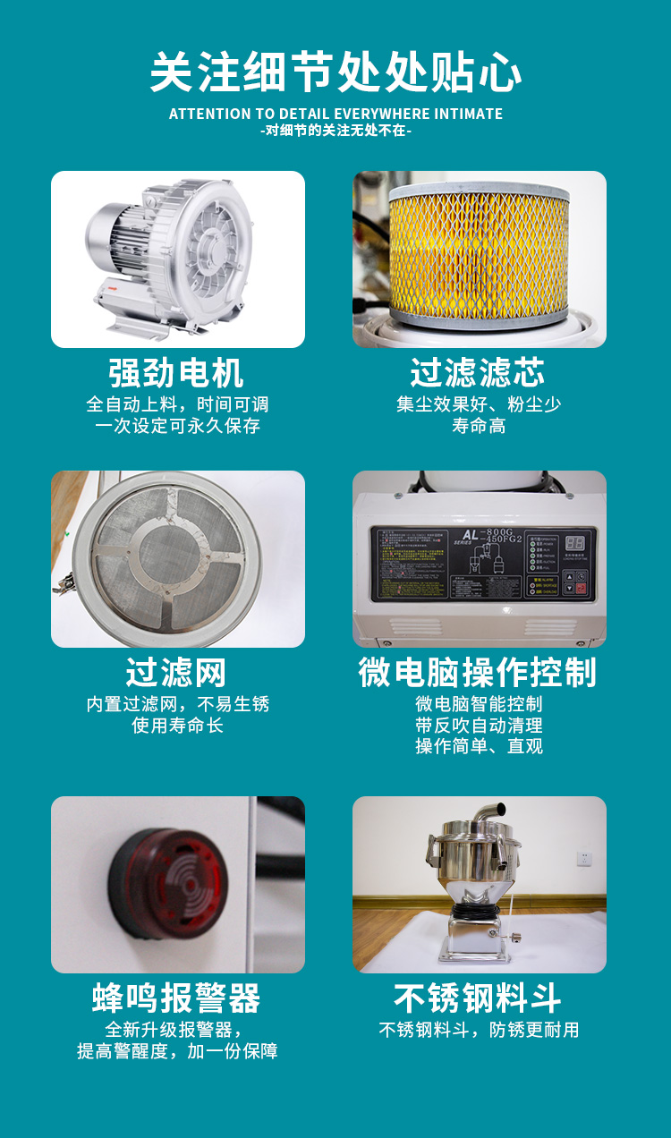 800G吸料机具备强大的吸力系统,能够快速、稳定地吸取各类物料。设备操作简单,配备了智能化的控制系统,用户可以轻松设置吸料的时间、速度和频率等参数,实现准确的物料输送。同时,它还拥有很好的密封性,防止物料在输送过程中的泄漏,在吸料能力方面,能够满足较大规模生产的需求。