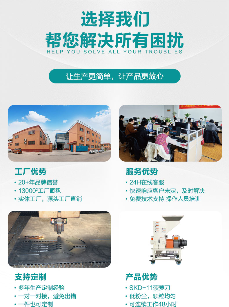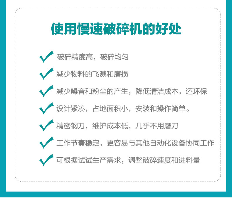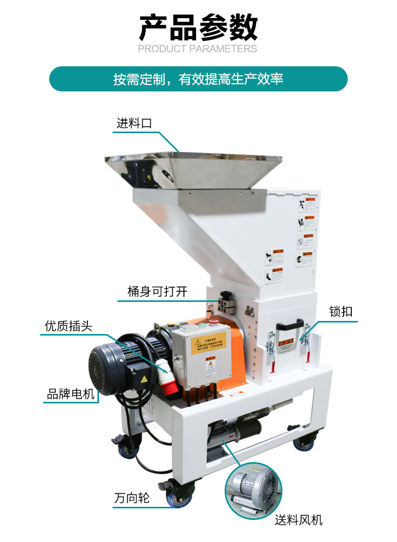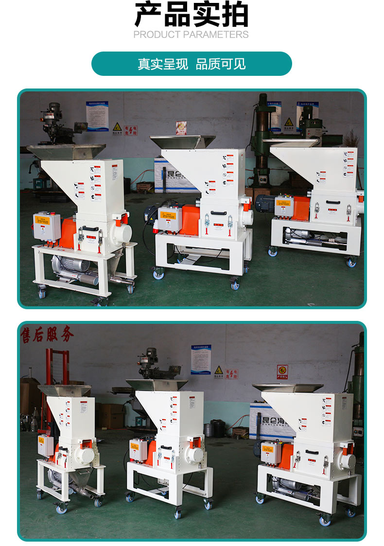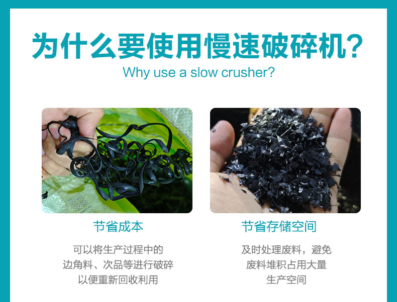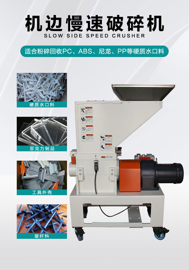 安捷能机边慢速破碎机功能:主要是用来破碎塑料废料、次品、边角料等的塑料回收设备,有时也被称作塑料切碎机或塑料随机。特别对热量塑料的次品塑料、塑料薄膜、塑料薄片等破碎效果较好。