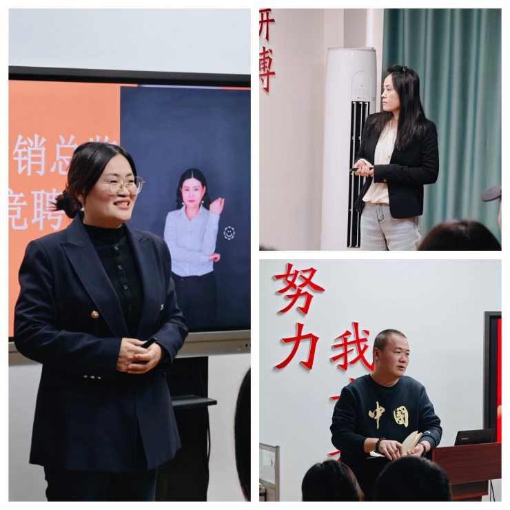 本次会议的重要环节是销售部内贸经理的选举。三位候选人依次上台演讲,针对2026年度工作目标提出了具体计划和实施方案。
