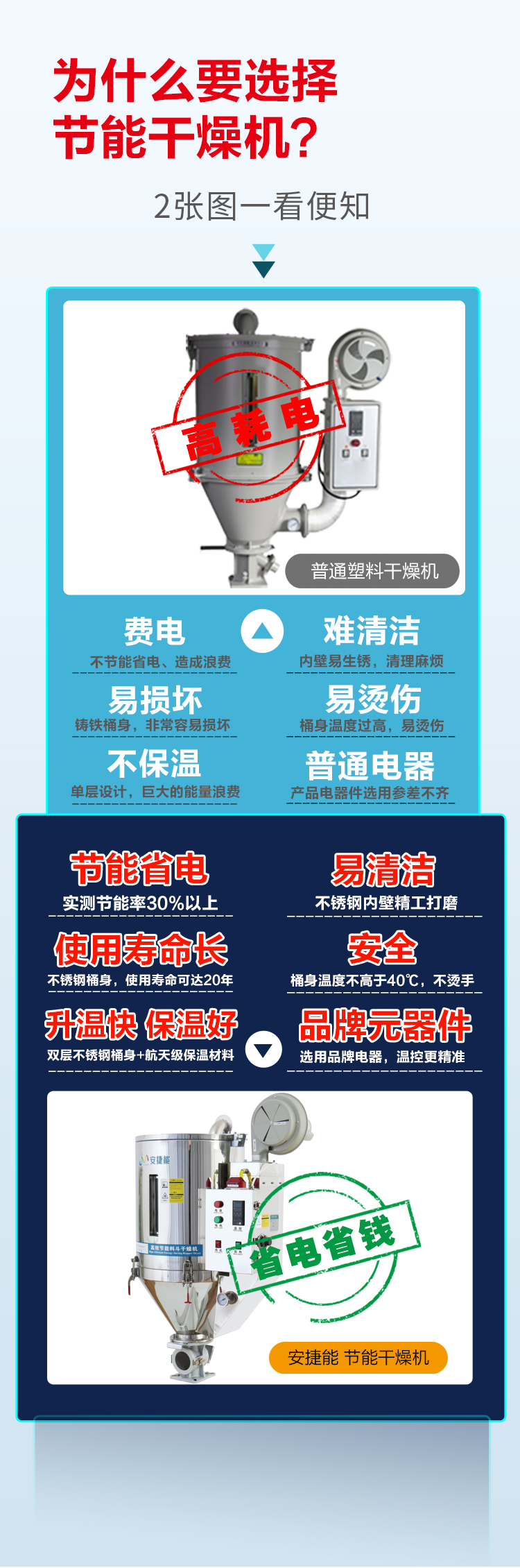 安捷能50KG节能料斗干燥机节能干燥机客户现场挂表节能干燥机客户改造案例节能干燥机和普通干燥机的区别普通干燥机(欧化单层)安捷能200KG节能料斗干燥机安捷能500KG节能料斗干燥机节能塑料干燥机