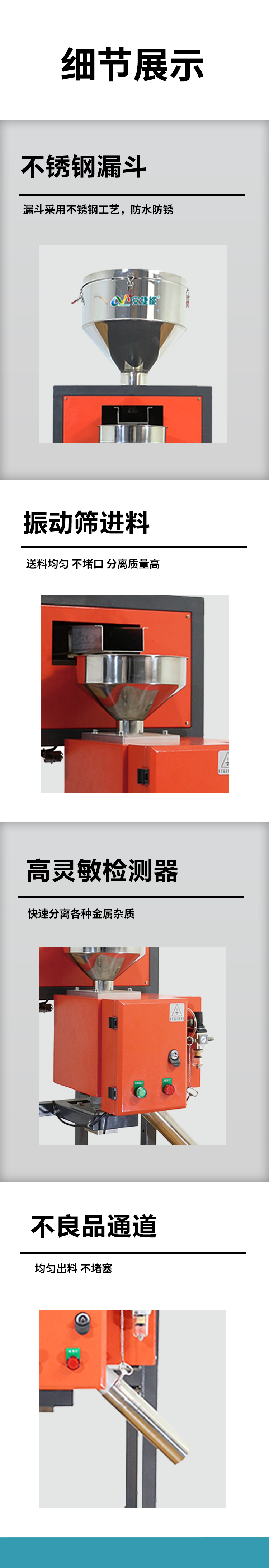金属分离器作用于检测和分离混在塑料原料中的所有金属包括铁类以及非铁类金属(如铜、铝、不锈钢)等 分离塑料、颗粒、粉末、回收料内掺杂金属物质急速识别,可分离≥0.2毫米的金属杂质